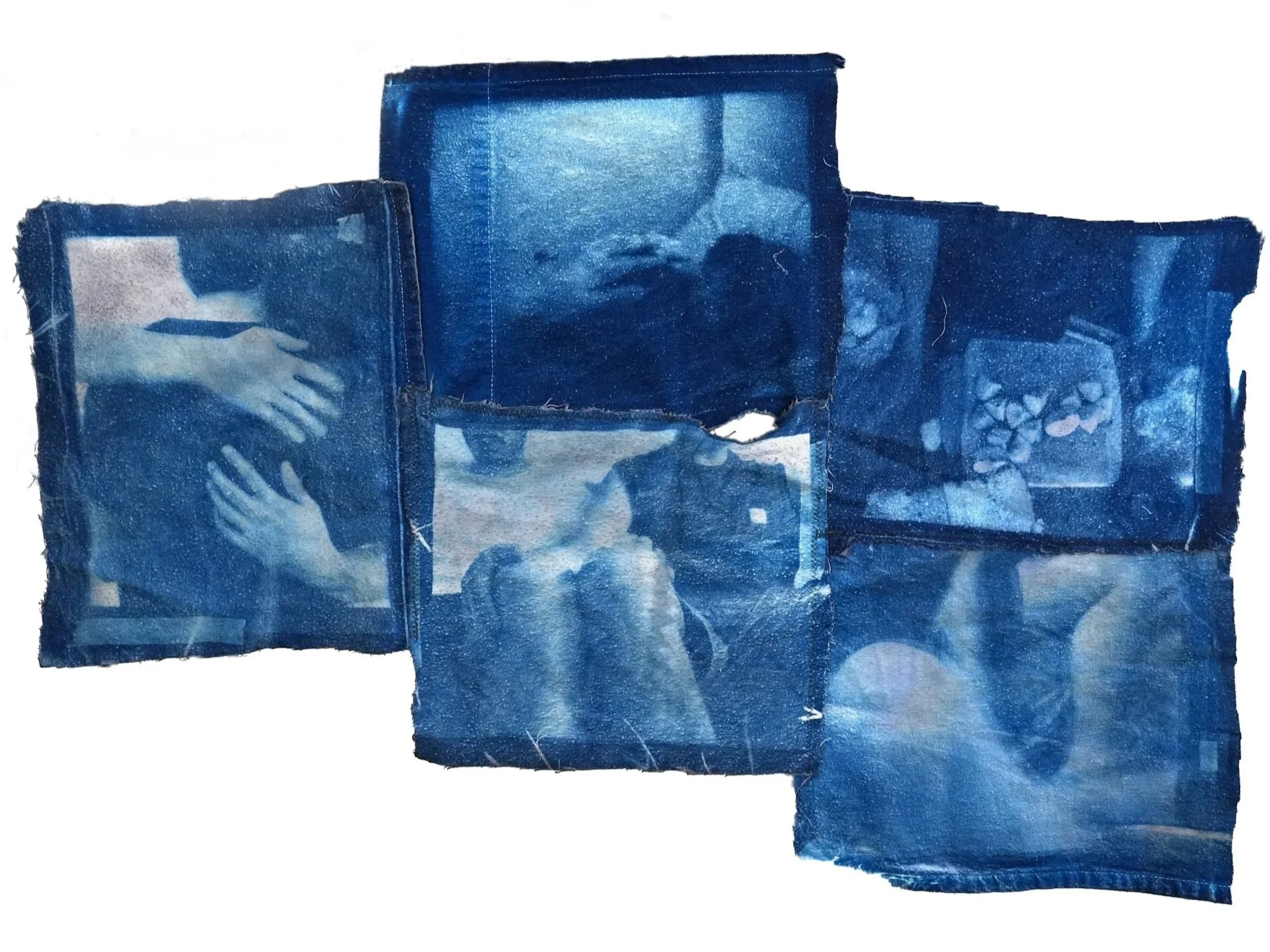 GAYBOYS, cyanotypes on cotton sheets, 18×12in., 2025. A love letter to being gay boys in love, to gay intimacy, tenderness, and innocence.
